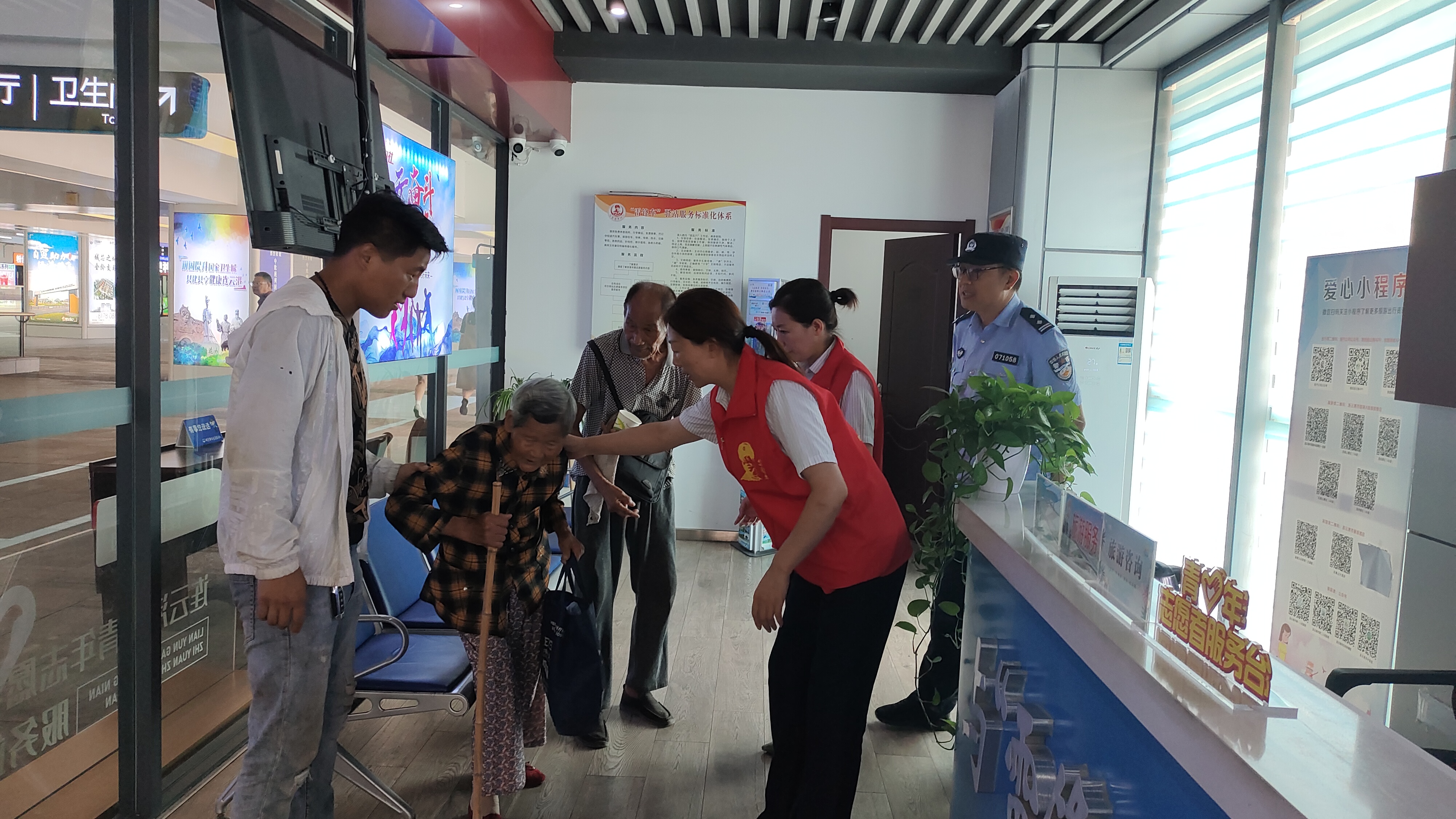 “雷锋车”手龚成艳和许静一看,忙上前搀扶老人到“雷锋车”驿站坐下,为他们端来了热水,询问老人有什么需要帮助的地方,但是由于老人年纪大了,说话又有很重的地方口音,只能大致了解到,老人张山(化名),91岁,老伴85岁,两位老人从板浦乘公交车到高铁站,说侄女婿王浩(化名)在高铁站上班,就想先到高铁站找侄女婿,下午有医生接他们去看病。龚成艳一听说有医生接他们去看病,就觉得不对劲。根据老人提供的信息,龚成艳带老人去高铁站服务台,让工作人员帮忙寻找侄女婿。可是,经询问高铁站并无此人。接着,老人又提出要自行前往医院去看病,由于两位老人人生地不熟,身上又带着不少看病的钱,龚成艳和许静担心老人上当受骗,为了稳住两位老人,找到他们的家人,龚成艳灵机一动,计上心来,遂当场“许诺”安排他们去医院看病,但是要有家里人陪同才行,龚成艳在老人随身携带的本子上找到了老人女儿的电话,并给老人女儿打电话说明情况,可是老人的女儿在外地,没有办法过来接老人。最终,龚成艳与老人的孙子取得联系,并将老两口的情况告诉了他。1120分左右,老人的孙子急匆匆地赶到了“雷锋车”驿站,由于两位老人出门没有跟家里任何人打招呼,所以,当他看到两位老人平安无事,他悬着的心也放了下来。