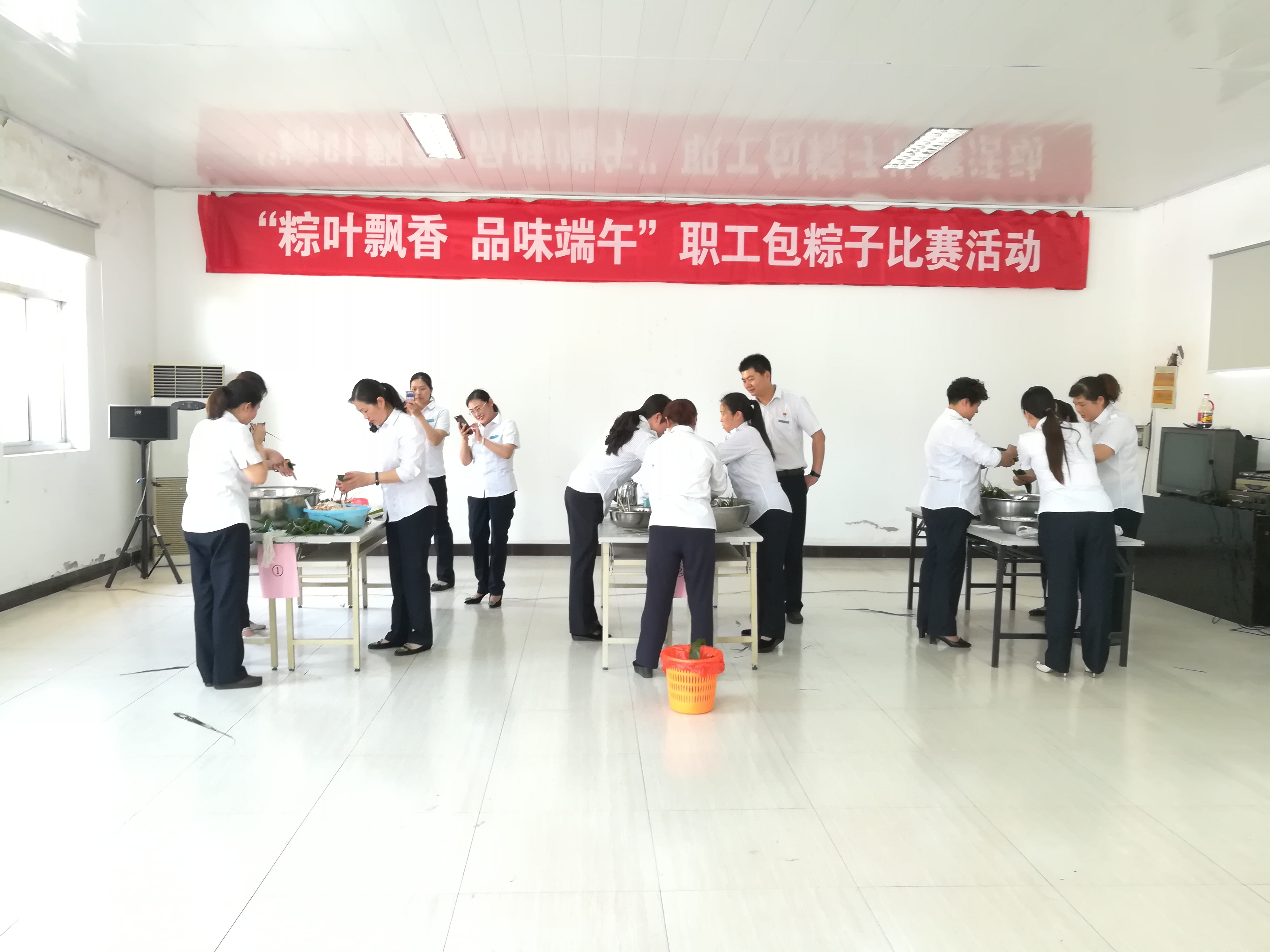 在包粽子过程中,选手们一边展示着自己包棕子的绝活,一边聊着天,一片欢声笑语,其乐融融。在不足半个小时的比赛中,包出了190多只棕子。比赛结束后,由经理江勇为获得第一名的小组颁奖。