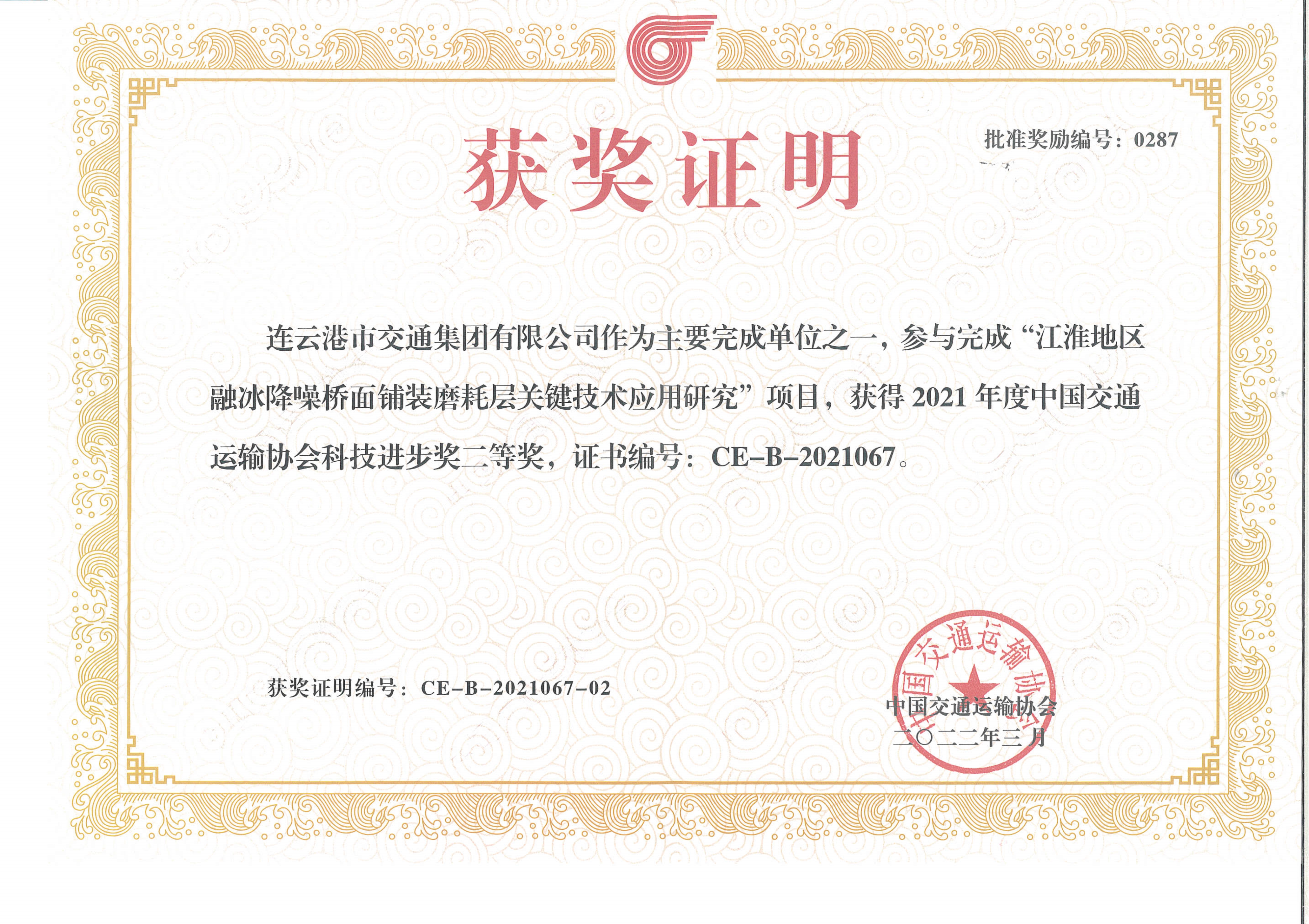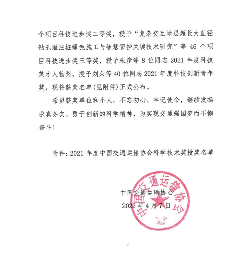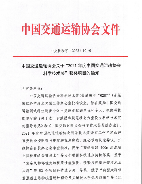 近日,中国交通运输协会发布了“2021年度中国交通运输协会科学技术奖”获奖项目名单,交通开云app最新版下载,开云(中国)联合苏交科开云app最新版下载,开云(中国)等单位申报的“江淮地区融冰降噪桥面铺装磨耗层关键技术应用研究”项目荣获中国交通运输协会科技进步奖二等奖。